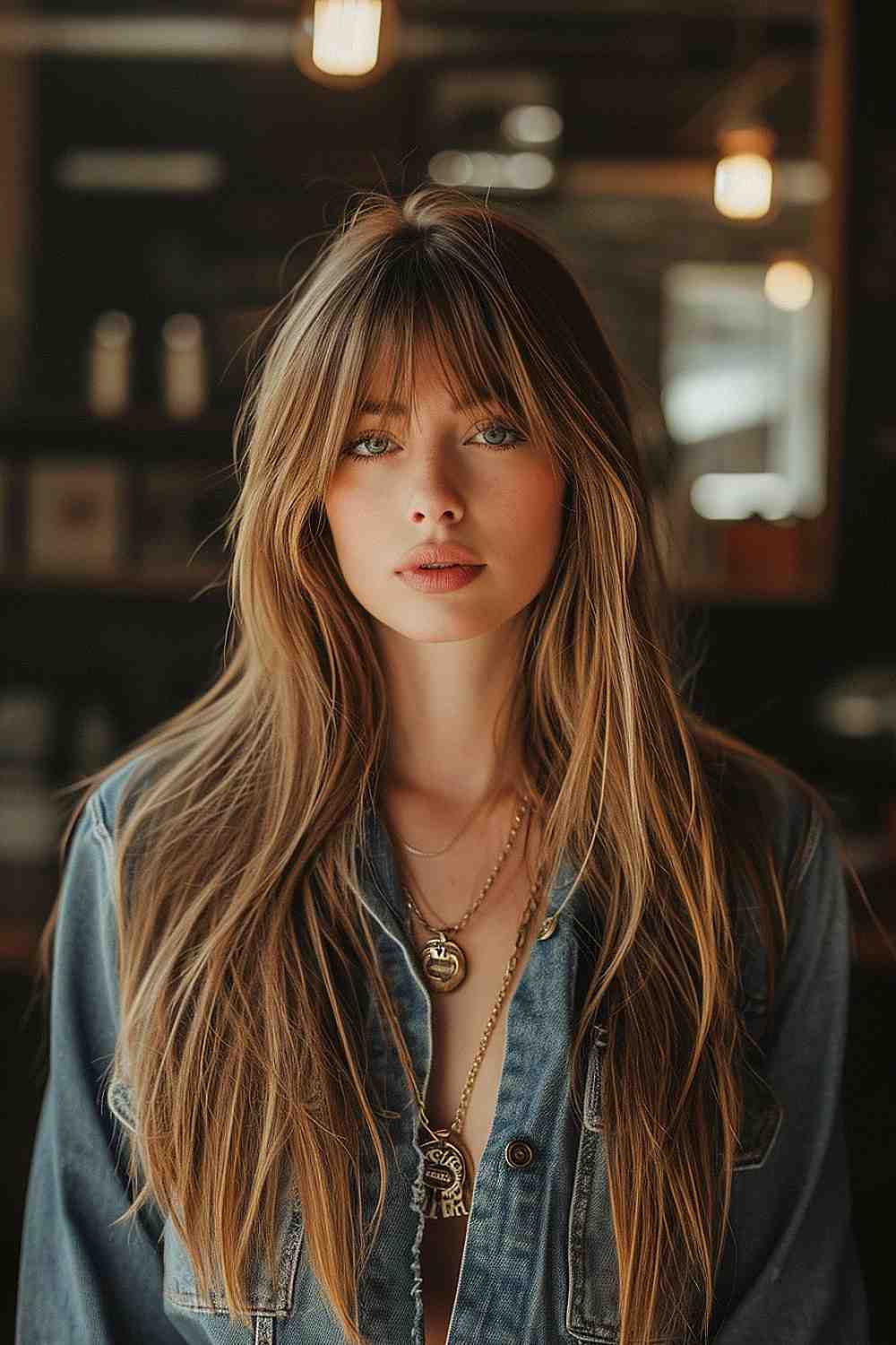This hairstyle captivates with its effortlessly chic long layers, softened by a delicate wispy fringe that frames the face beautifully. The seamless blending of the fringe into the rest of the hair adds a touch of bohemian elegance, perfect for the woman who loves a blend of carefree style with a hint of structure. The sun-kissed highlights suggest a balayage technique, offering depth and dimension to the straight tresses.