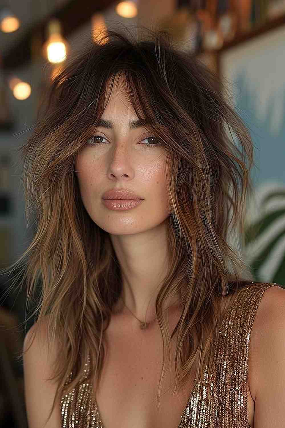 This medium-length shag haircut breathes new life into the concept of glamour, tailored for the contemporary woman. The layered waves, infused with subtle volume, frame the face elegantly, while the tousled, lived-in look adds a hint of casual sophistication. It’s an ideal style for those who covet a touch of red-carpet flair in their everyday life.