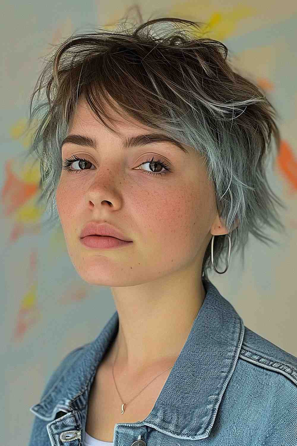 This ear-length mixie cut, a bold amalgamation of a pixie and mullet, is artfully crafted for a 38-year-old woman with a fashion-forward spirit. The tousled layers and feathered texture provide an edgy yet feminine appeal, while the muted grey tones add a touch of contemporary sophistication. It’s a statement hairstyle that speaks to her daring personality and unique sense of style.