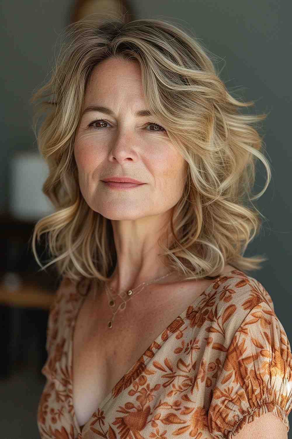 This shoulder-length haircut, with its gentle layers, offers a soft and breezy look ideal for a woman in her 50s. The subtle graduation of lengths creates a feather-light frame around the face, enhancing her natural beauty without overwhelming it. It’s a style that speaks to grace and ease, perfect for those who prefer understated elegance.