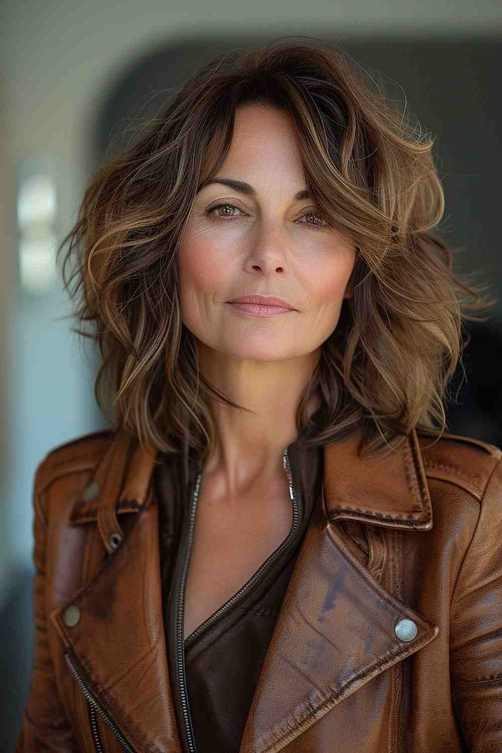 This voluminous layered cut is a luxurious choice for the thick-haired woman in her 40s, offering both style and manageability. The strategic layers reduce weight while adding shape, creating a full-bodied look that moves gracefully. The varying lengths accentuate natural texture, and the soft waves around the face add a youthful, yet polished charm.