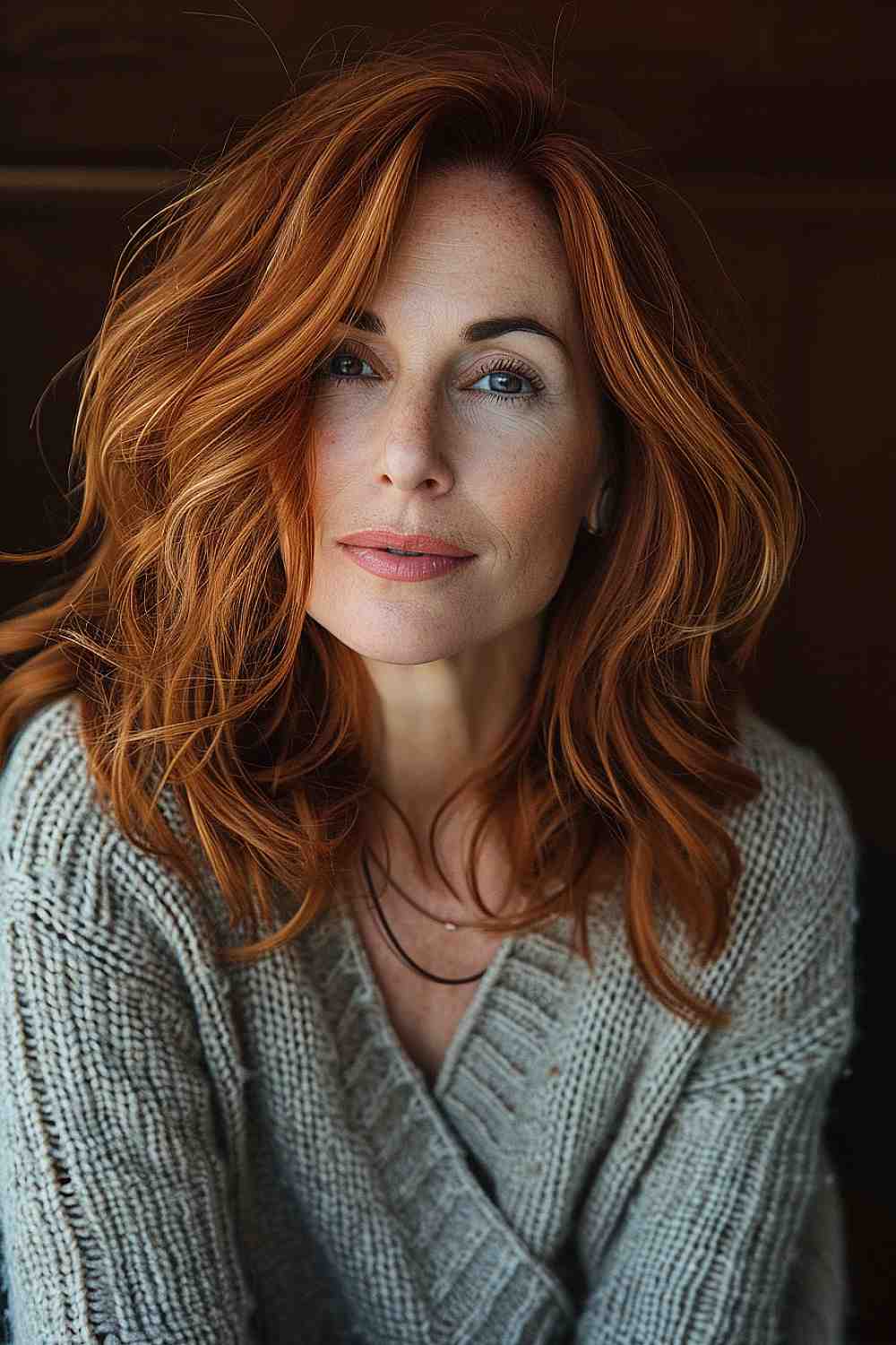 The rich auburn hue of this mid-length hairstyle radiates a warm, inviting aura, perfect for a 45-year-old woman seeking to highlight her vivacious spirit. The waves add a playful yet sophisticated bounce, creating a sense of volume and movement that flatters the facial contours. This look is an exquisite match for those wishing to embrace their natural grace with a color that’s both vibrant and classically feminine.