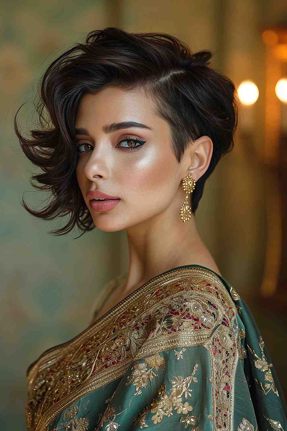 This elegant wavy bob with a soft undercut seamlessly combines traditional Indian aesthetics with a modern twist. The waves add a dynamic movement, softening the edginess of the undercut, which gives the style a unique silhouette. It’s a versatile choice for the Indian woman who wants to maintain a sense of her heritage while embracing a contemporary look.