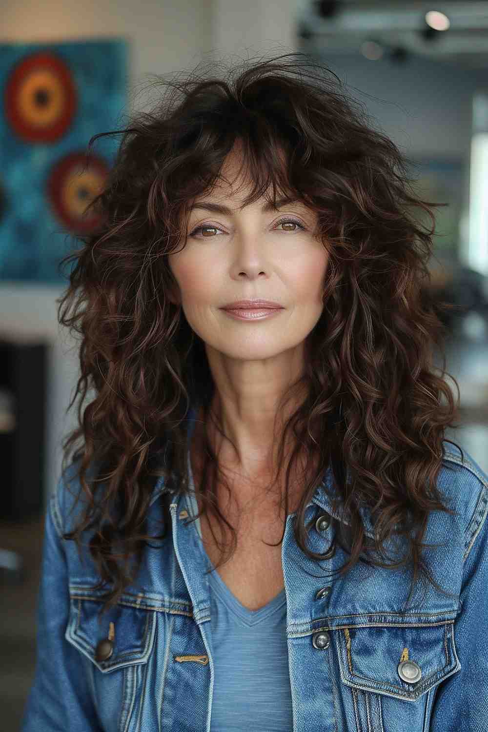 This curly shag haircut adorned with bangs is a fabulous choice for a middle-aged woman looking to infuse a fun and youthful spirit into her style. The dynamic curls add volume and texture, creating an effervescent look that’s both chic and carefree. The fringe softens the face, while the layered cut promotes movement, making for a lively and rejuvenating appearance.