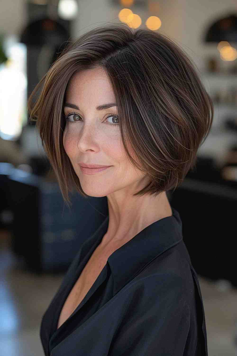 This A-line bob showcases a harmonious blend of structure and movement, perfect for the sophisticated woman over 50 who desires a style that balances contemporary flair with classic finesse. The subtle highlights add a gentle contrast, giving depth and dimension to the chocolate brown base, creating a soft yet impactful visual appeal. The precision cutting technique ensures a flattering silhouette that gracefully frames the face, making it a versatile choice for various occasions.