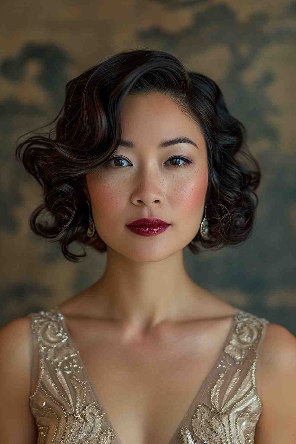 This hairstyle is a nod to the timeless beauty of the 1920s, with short hair meticulously styled into retro finger waves. The glossy waves sculpt the face, highlighting the model’s delicate features with an air of old-school sophistication. Perfect for an Asian woman seeking to infuse a touch of historical elegance into her style, these waves are the epitome of vintage glamour with a modern flair.