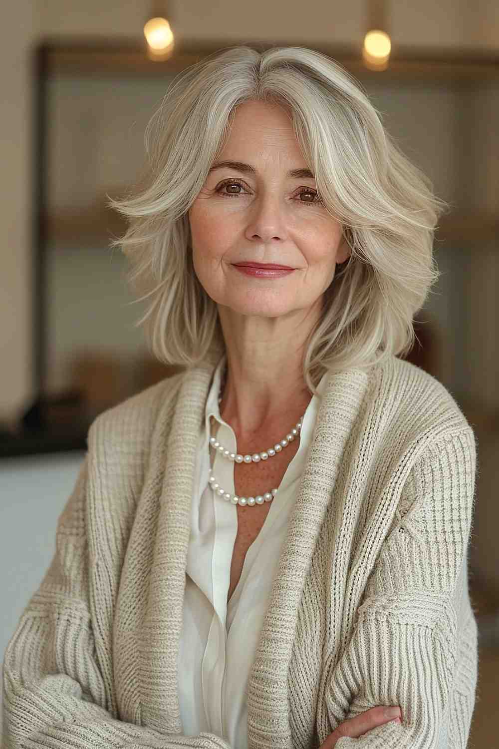 This sophisticated long bob, or ‘lob’, is a testament to timeless beauty, specifically tailored for women over 60 who appreciate elegance and grace. The silver hue enhances the natural beauty of aging hair, while the soft layers around the face gently cascade to create a rejuvenating and voluminous effect. This style is perfect for those seeking a blend of classic charm and modern simplicity.