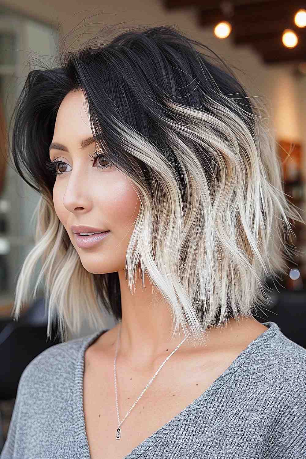 This angled lob is a stunning choice for the Asian-American woman in her late 30s, showcasing textured waves that create an illusion of volume and movement. The contrast of dark roots fading into a light ash blonde adds a contemporary twist to the classic lob, offering a look that’s both edgy and sophisticated. This style is perfect for those seeking to make a statement with their hair, combining sharp angles with soft, beachy waves.