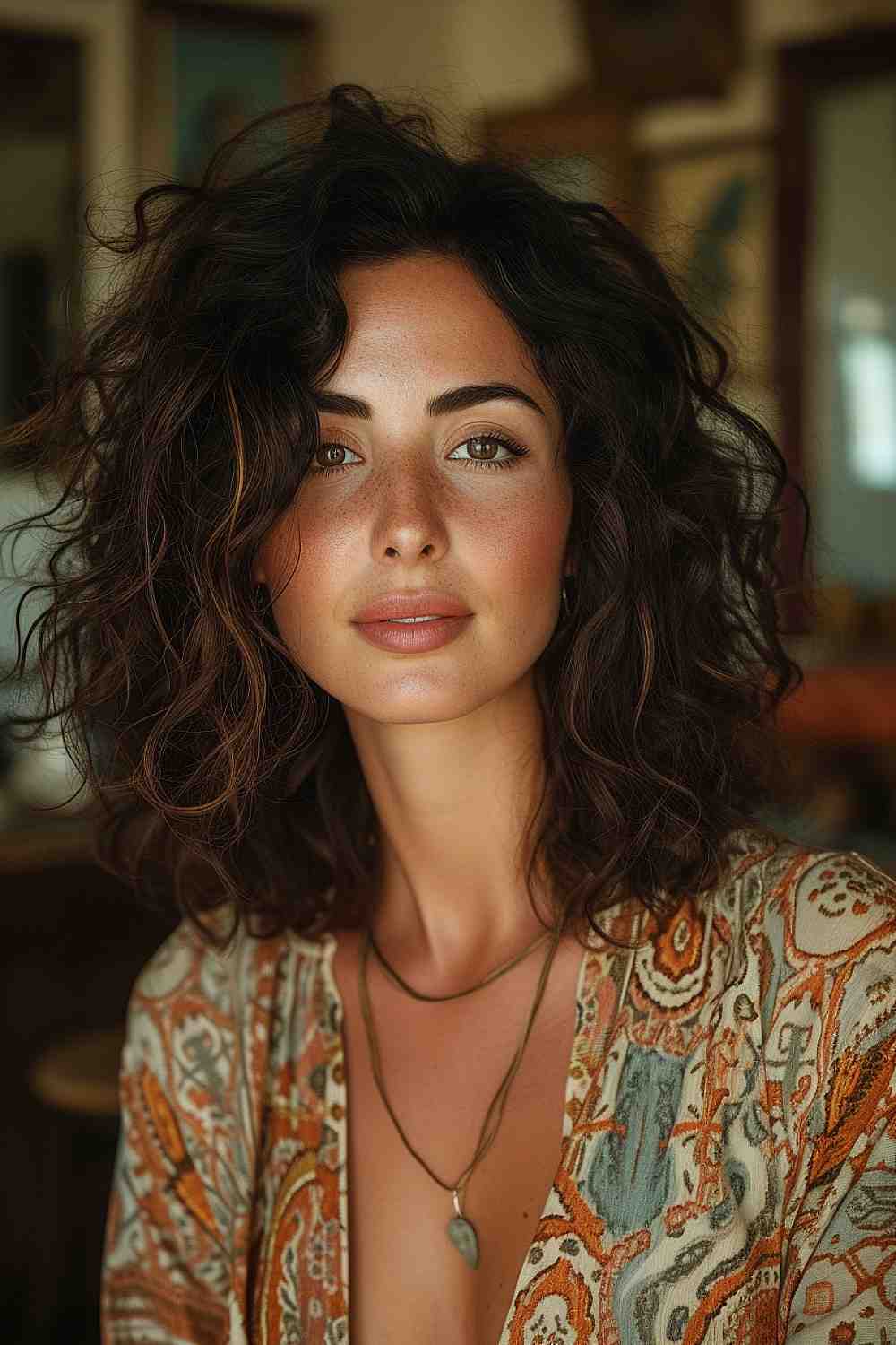 This bold and curly lob is a celebration of confidence and vivacity, perfectly suited for the spirited woman. The voluminous curls bounce with life, framing the face with a soft yet assertive touch. It’s a versatile cut that embodies both the casual charm and the commanding presence of a woman who embraces her natural texture with poise.