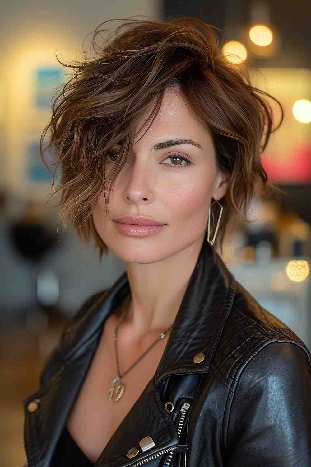 This hairstyle features bold short layers, giving a confident and dynamic edge to the modern woman. The tousled texture and volume at the crown create a playful yet assertive look, embodying a sense of freedom and self-assurance. It’s a perfect match for those who carry their boldness not just in their style, but in their very essence.