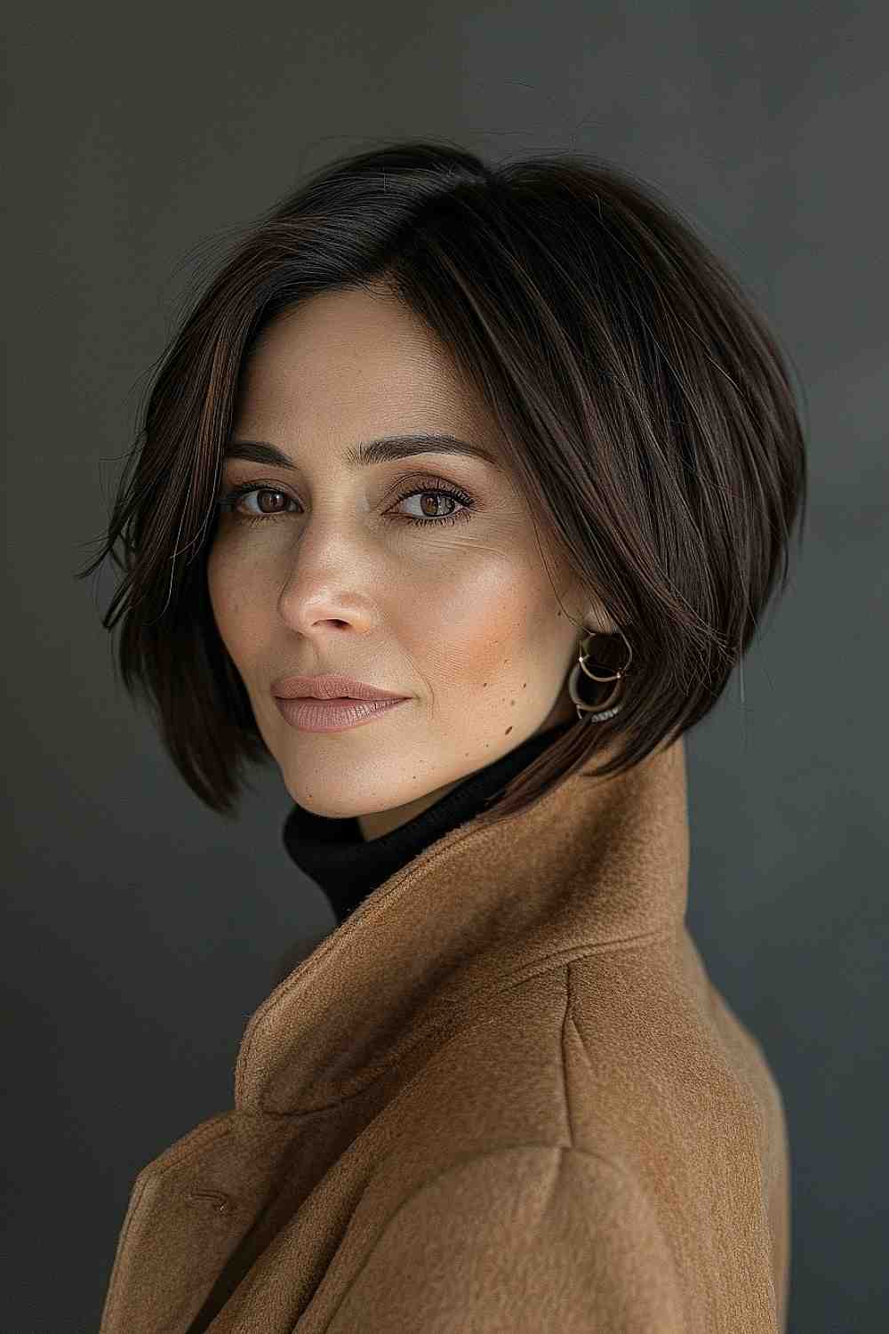 This sleek, chin-length angled bob is the embodiment of poise and professionalism for a 40-year-old woman. Its clean lines and smooth texture reflect her meticulous nature, while the angle accentuates her jawline, offering a subtle yet impactful statement in the workplace. It’s a hairstyle that balances elegance and assertiveness, perfect for the woman who commands respect in her field.