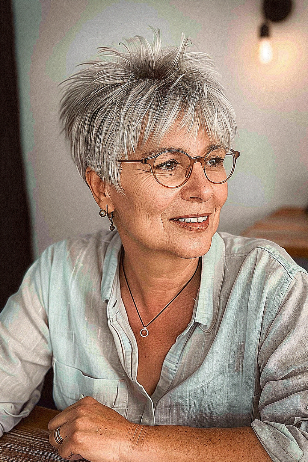 This textured pixie cut is the epitome of effortless style, offering a light and airy feel that’s both modern and timeless. The layers are snipped with precision to create a natural, feathered effect that adds movement and depth to the silver strands. It’s a go-to choice for the spirited woman who loves a quick morning routine and a fresh, youthful look all day long.