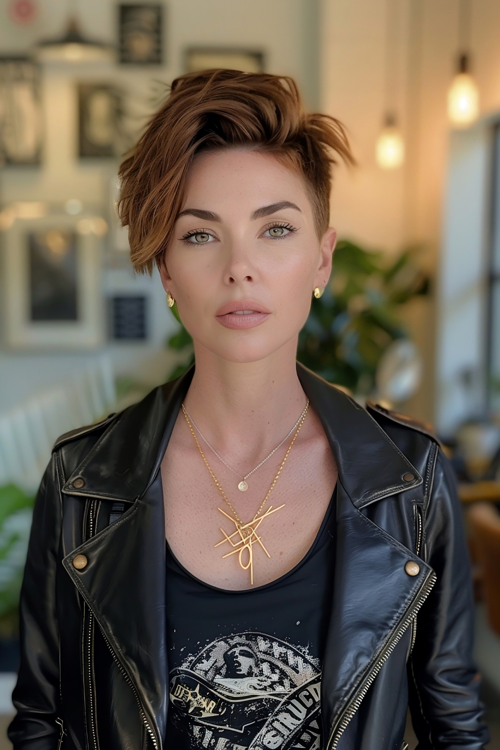The undercut pixie showcased here is a perfect blend of edgy and classic, giving it a modern twist that’s both daring and sophisticated. The tousled top layers add volume and a soft contrast to the shorter, shaved sides, creating a look that’s versatile and easy to style. This cut is ideal for those who want to make a statement with minimal effort, complementing the caramel skin tone with its warm hues.