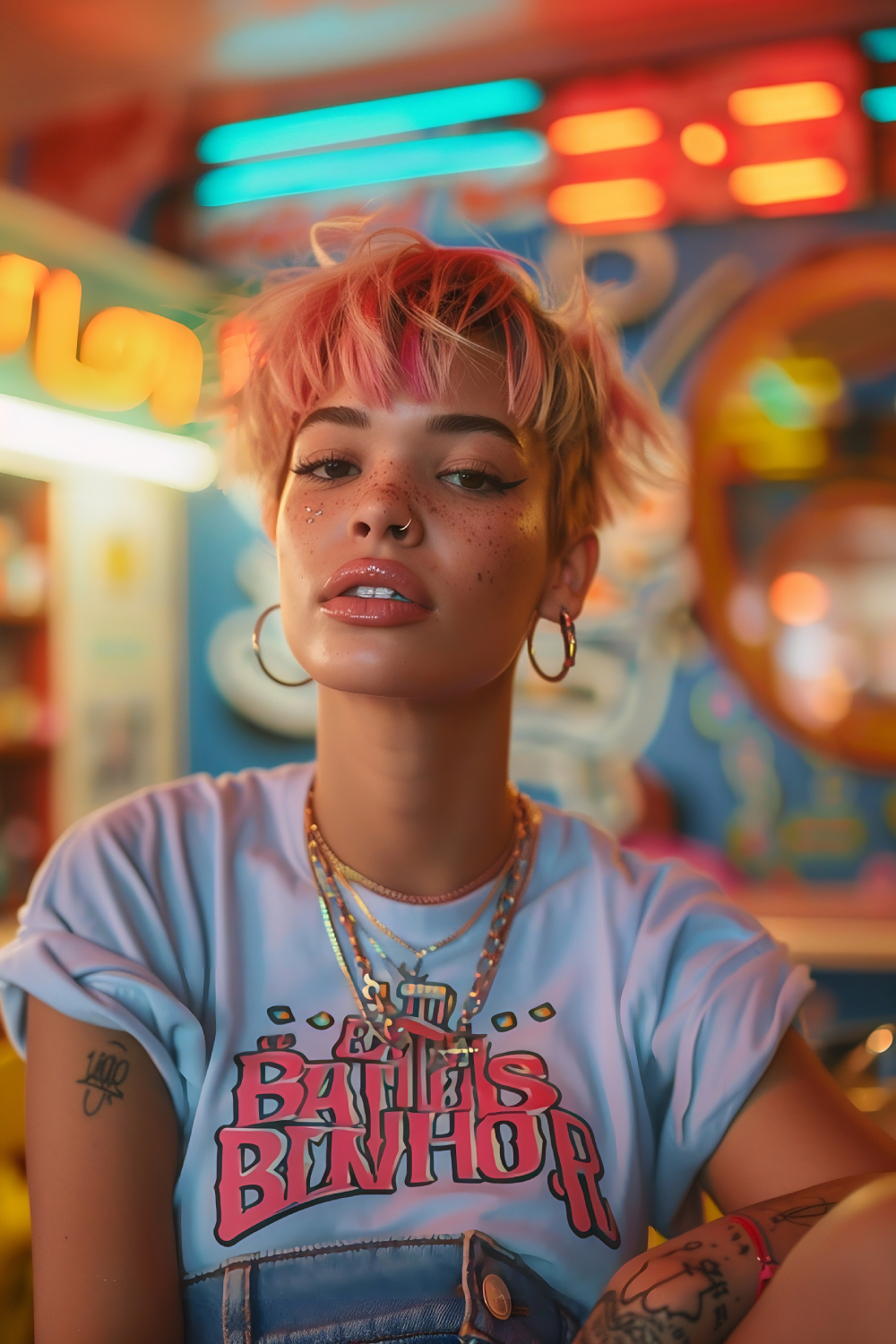 This choppy pixie cut is a daring choice that perfectly captures a vibrant, youthful spirit. The neon pink peek-a-boo highlights add a playful twist to the sandy blonde base, while the textured layers create a dynamic, tousled look that’s easy to manage but full of personality. It’s an ideal style for those looking to make a bold fashion statement with minimal styling effort.