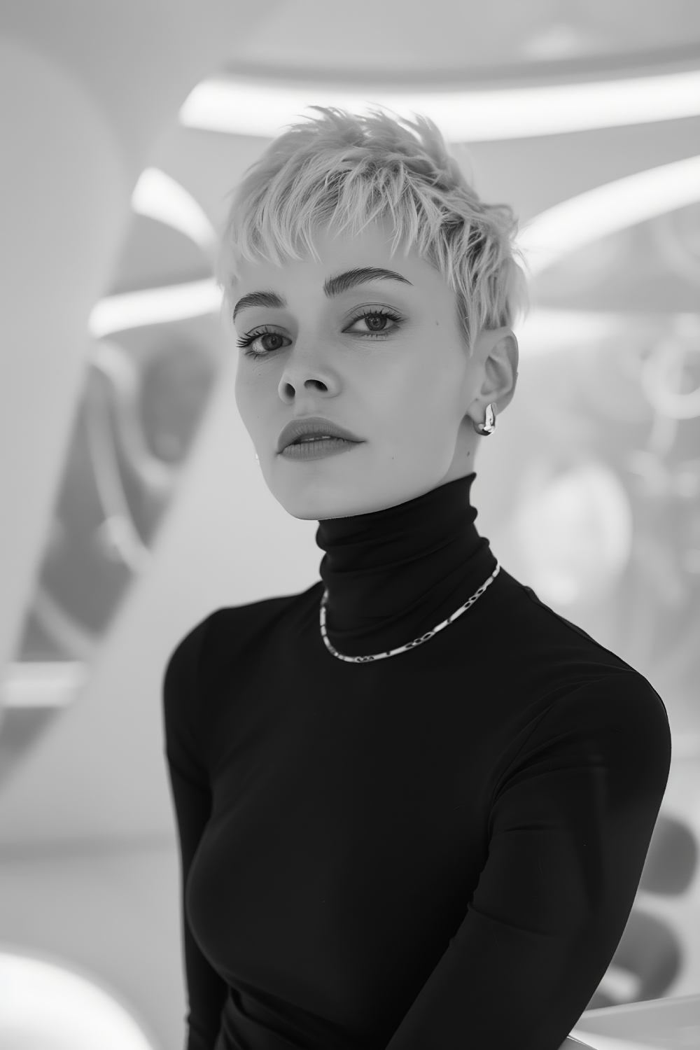 Capturing the essence of edgy sophistication, this modern pixie cut is crafted with razor-cut layers to create a textured, dynamic look. The feather-light layers give the hair an airy quality that beautifully complements the stark, fashionable lines of her turtleneck, creating a portrait of modern femininity.