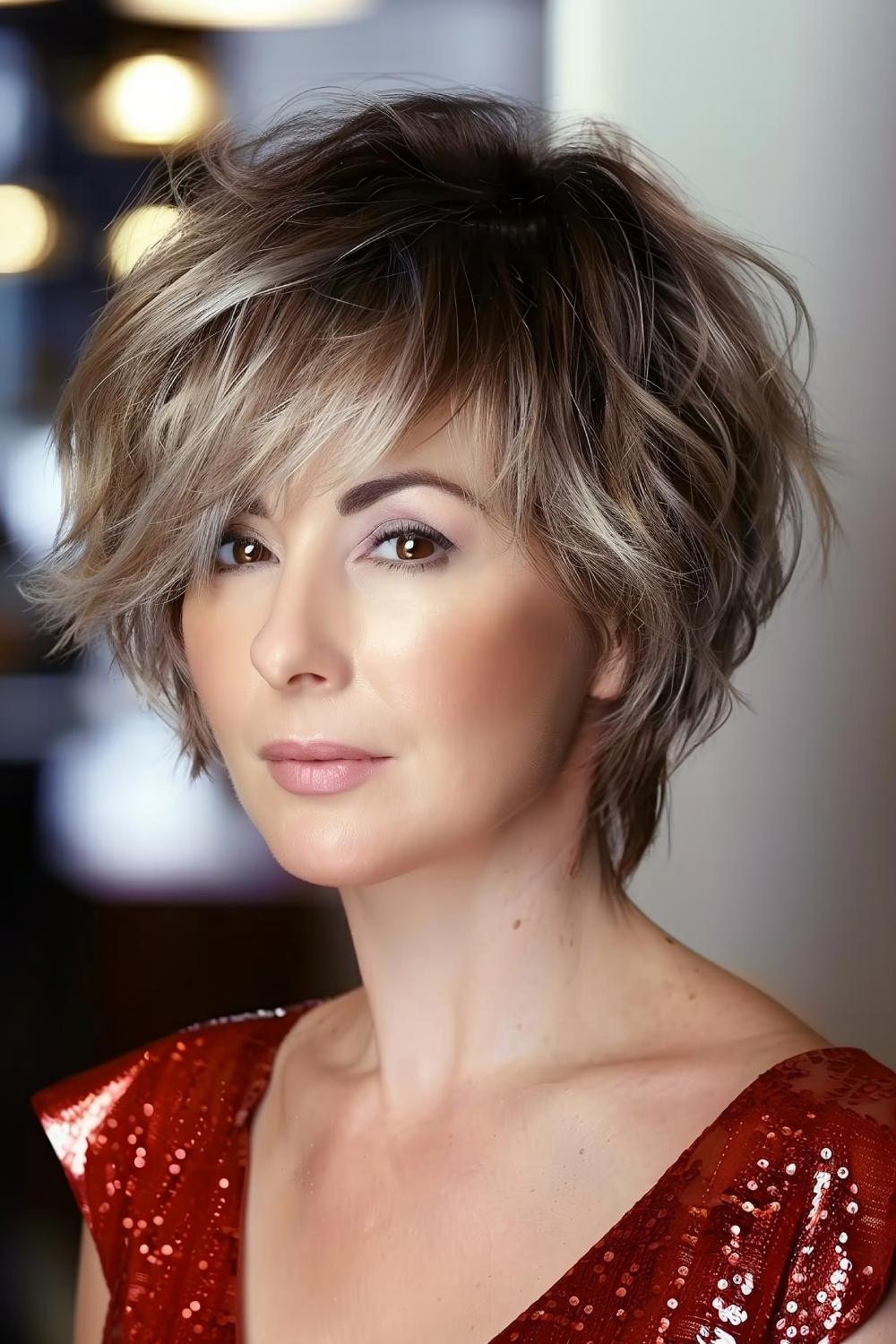 Flaunting an irresistibly sassy vibe, this voluminous pixie cut boasts dynamic texture and movement, achieved through expertly layered and tousled strands. The contrasting colors, with darker roots fading into a sun-kissed blonde, amplify the boldness of the style, making it the ideal choice for anyone looking to boost their confidence with a spirited and modern look.