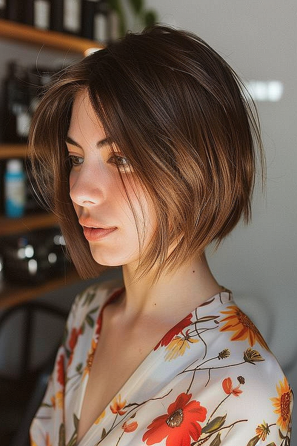 Captured in a serene setting, this angled bob haircut is the epitome of modern elegance for straight hair, featuring precise, clean lines that graduate smoothly from the nape of the neck to the chin. The subtle balayage highlights enhance the dimension of the cut, making each strand appear luminous and full of life. It’s a versatile look that can transition effortlessly from a casual daytime vibe to sophisticated evening flair.